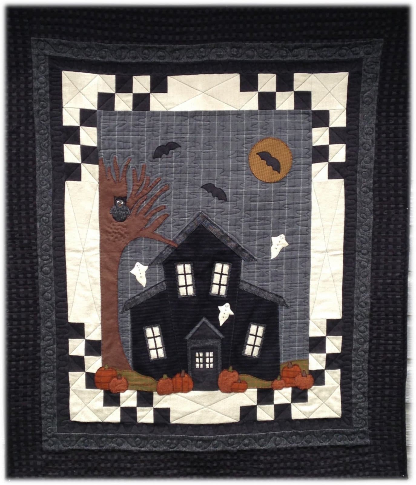 This happy, halloween/fall quilt will be perfect to snuggle under chilly autumn nights or great on a focal wall. Features flannel (or cotton) applique with some simple background piecing. Quilt finished size: 47 x 57 inches.