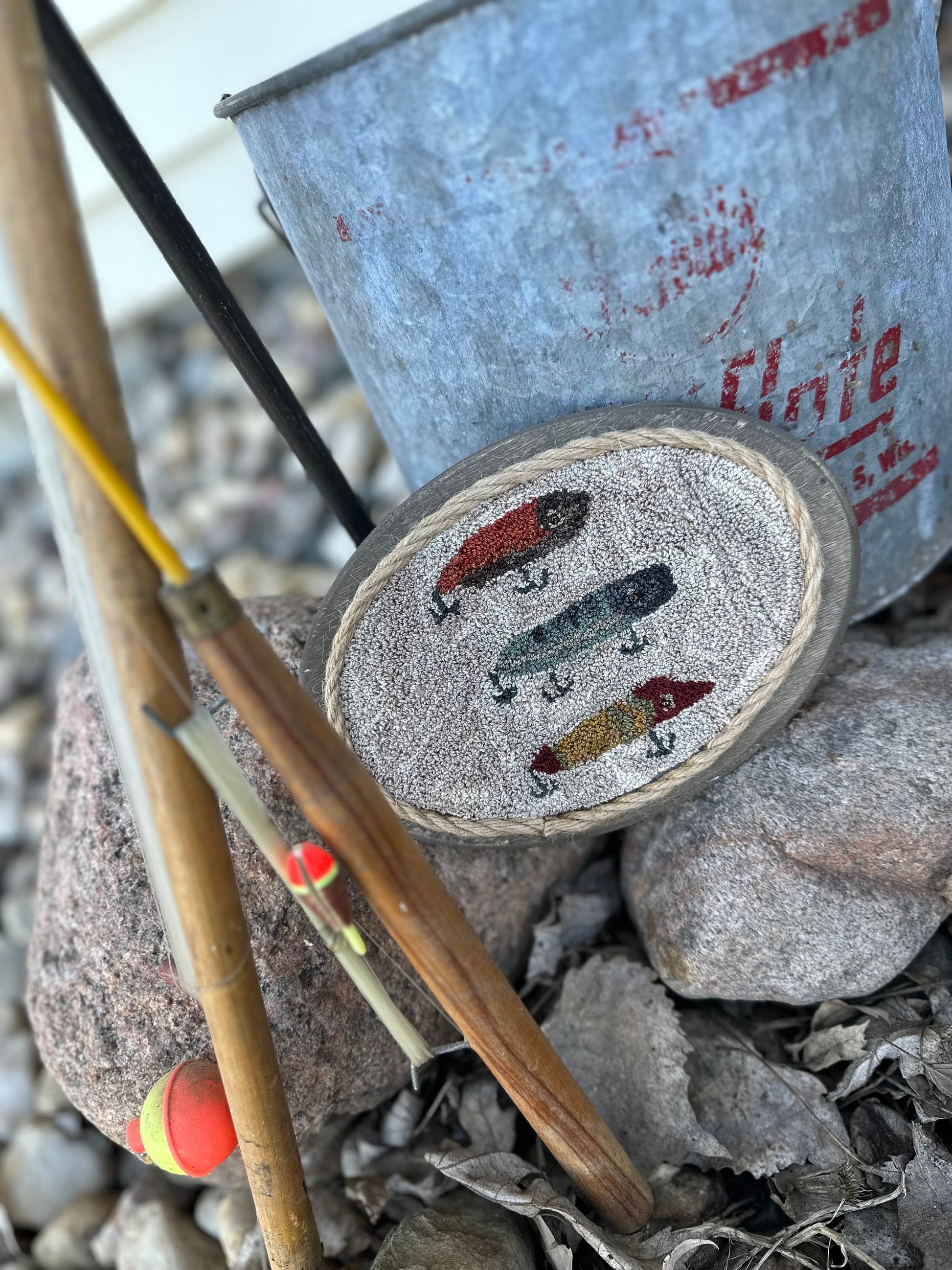 Punchneedle pattern to create this nod to old fishing lures. project fits on a 5 1/2” x 7 1/2” oval frame. Pattern includes fat quarter of weavers cloth. No thread included. Pattern designed by lacey pietig of Pastthyme Patterns