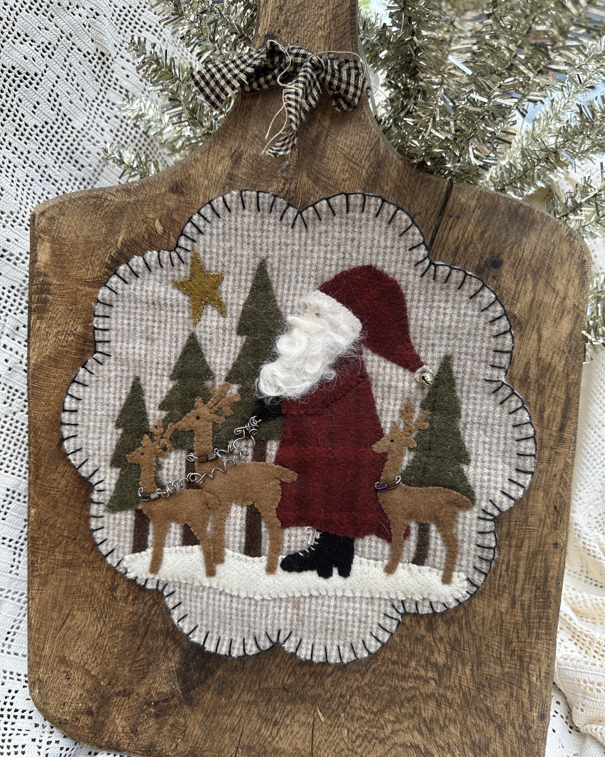 Pattern to create a 10 x 10 inch wool Santa applique project.